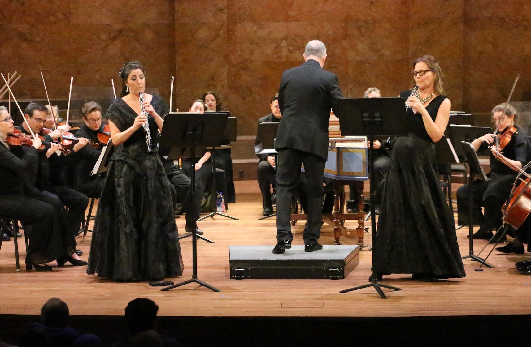 In Extra(ordinarily Fancy, Viet Cuong uses the baroque concerto style as a template for postmodern roleplaying.  The format may have been from a distant era, but the music certainly wasn’t. The soloists, oboists Lillian Copeland and Erin Gustafson, traded a chromatic theme back and forth, but whereas  Copeland played the piece in conventional fashion, Gustafson distressed the lines with multiphonics, alternate fingerings producing multiple pitches. She hooted back at her partner in mischievous fashion. The puckish nature of their interplay was enacted enthusiastically. The orchestra got into a rambunctious spirit themselves, most memorably in a passage in which pizzicato strings seemed to goad the soloists to new heights in their sparring match. Eventually, Copeland relented, playing a multiphonic close with Gustafson.